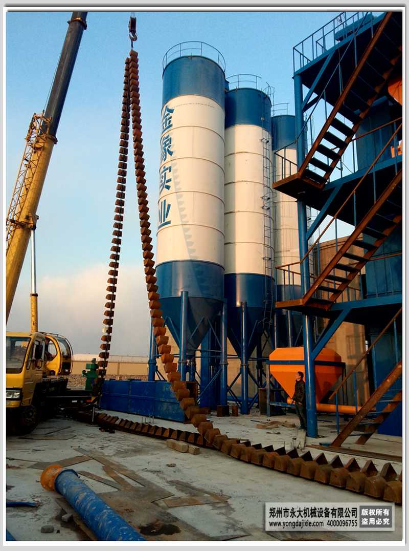 山東威海年產(chǎn)30萬噸干混砂漿攪拌站,使用新型的HJS5000型雙軸無重力混合機(jī)為攪拌主機(jī),采用22KW*2雙動力輸入,帶有同步連桿,保證強(qiáng)勁的動力同時(shí)又防止無重力混合機(jī)槳葉錯位打架現(xiàn)象的發(fā)生,較傳統(tǒng)雙軸依靠鏈條傳動控制雙軸攪拌原理進(jìn)一步提升,總?cè)莘e8m3,單批次攪拌量5噸。提升設(shè)備選用的是提升量更大、穩(wěn)定性更好的板鏈?zhǔn)教嵘龣C(jī)。