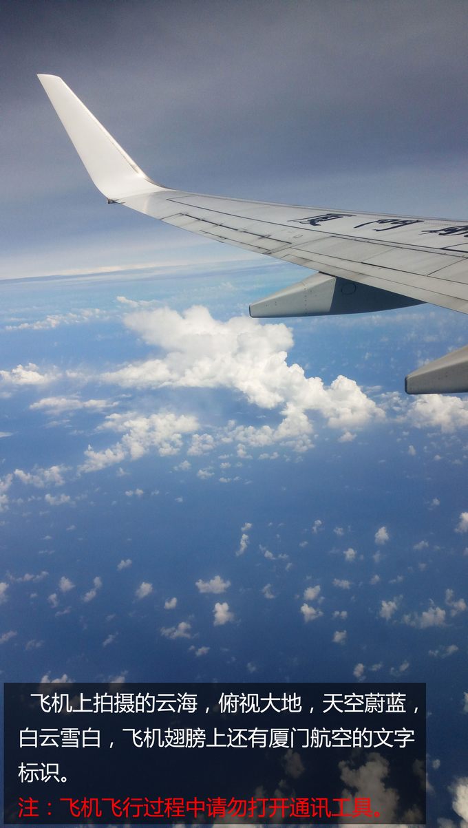 飛機(jī)上拍攝的云海,俯視大地,天空蔚藍(lán),白云雪白,飛機(jī)翅膀上還有廈門航空的文字標(biāo)識。注:使用相機(jī)拍攝,飛機(jī)飛行過程中請勿打開通訊工具。