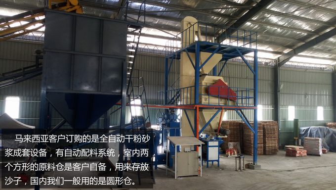 馬來西亞客戶訂購的是全自動干粉砂漿成套設(shè)備,有自動配料系統(tǒng),室內(nèi)兩個方形的原料倉是客戶自備,用來存放沙子,國內(nèi)我們一般用的是圓形倉。