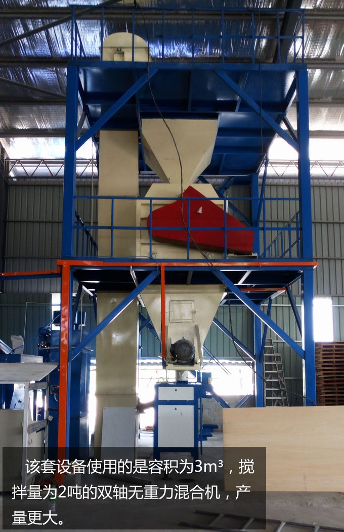 該套設(shè)備使用的是容積為3m3,攪拌量為2噸的雙軸無重力混合機(jī),產(chǎn)量更大。