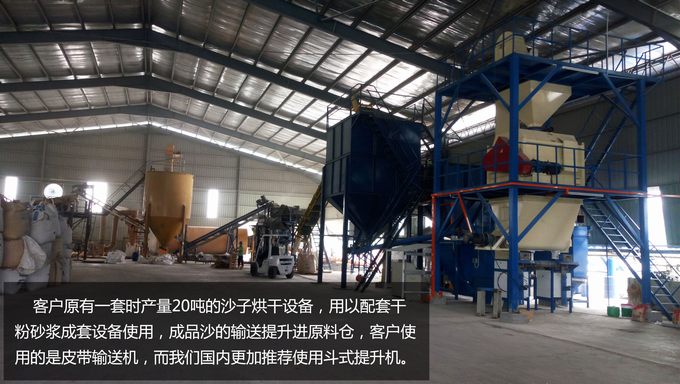 客戶原有一套時產(chǎn)量20噸的沙子烘干設(shè)備,用以配套干粉砂漿成套設(shè)備使用,成品沙的輸送提升進(jìn)原料倉,客戶使用的是皮帶輸送機(jī),而我們國內(nèi)更加推薦使用斗式提升機(jī)。