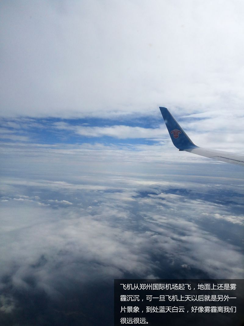 飛機(jī)從鄭州國際機(jī)場(chǎng)起飛,地面上還是霧霾沉沉,可一旦飛機(jī)上天以后就是另外一片景象,到處藍(lán)天白云,好像霧霾離我們很遠(yuǎn)很遠(yuǎn)。