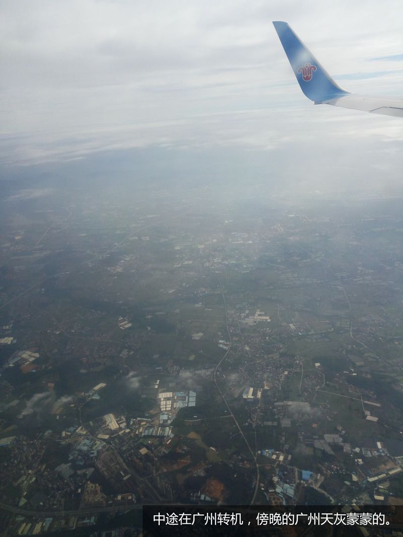 中途在廣州轉(zhuǎn)機(jī),傍晚的廣州天灰蒙蒙的。