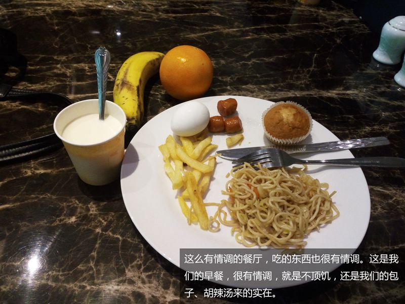 這么有情調(diào)的餐廳,吃的東西也很有情調(diào)。這是我們的早餐,很有情調(diào),就是不頂饑,還是我們的包子、胡辣湯來的實(shí)在。