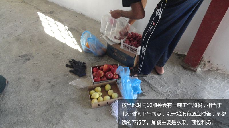 按當(dāng)?shù)貢r(shí)間10點(diǎn)鐘會(huì)有一噸工作加餐,相當(dāng)于北京時(shí)間下午兩點(diǎn),剛開始沒有適應(yīng)時(shí)差,早都餓的不行了。加餐主要是水果、面包和奶。