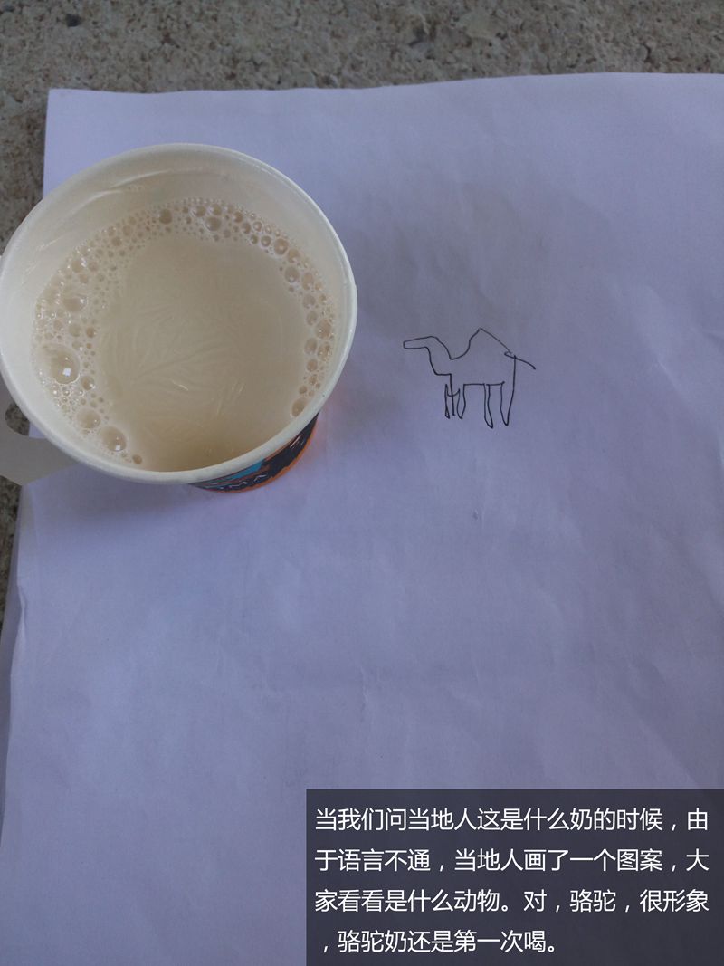 當(dāng)我們問當(dāng)?shù)厝诉@是什么奶的時(shí)候,由于語言不通,當(dāng)?shù)厝水嬃艘粋€(gè)圖案,大家看看是什么動(dòng)物。對(duì),駱駝,很形象,駱駝奶還是第一次喝。